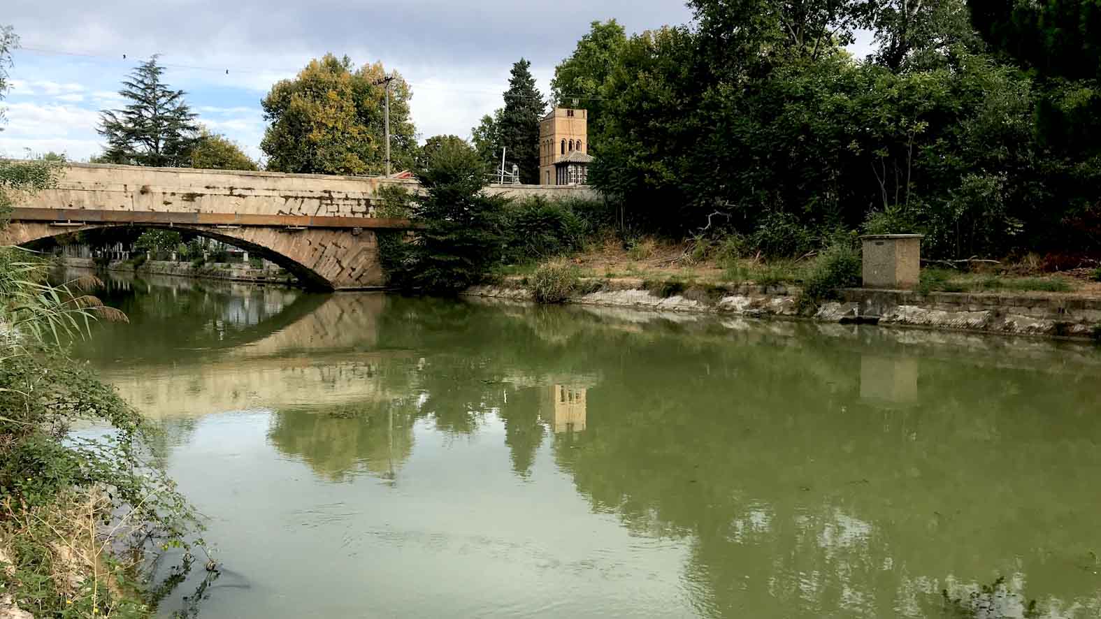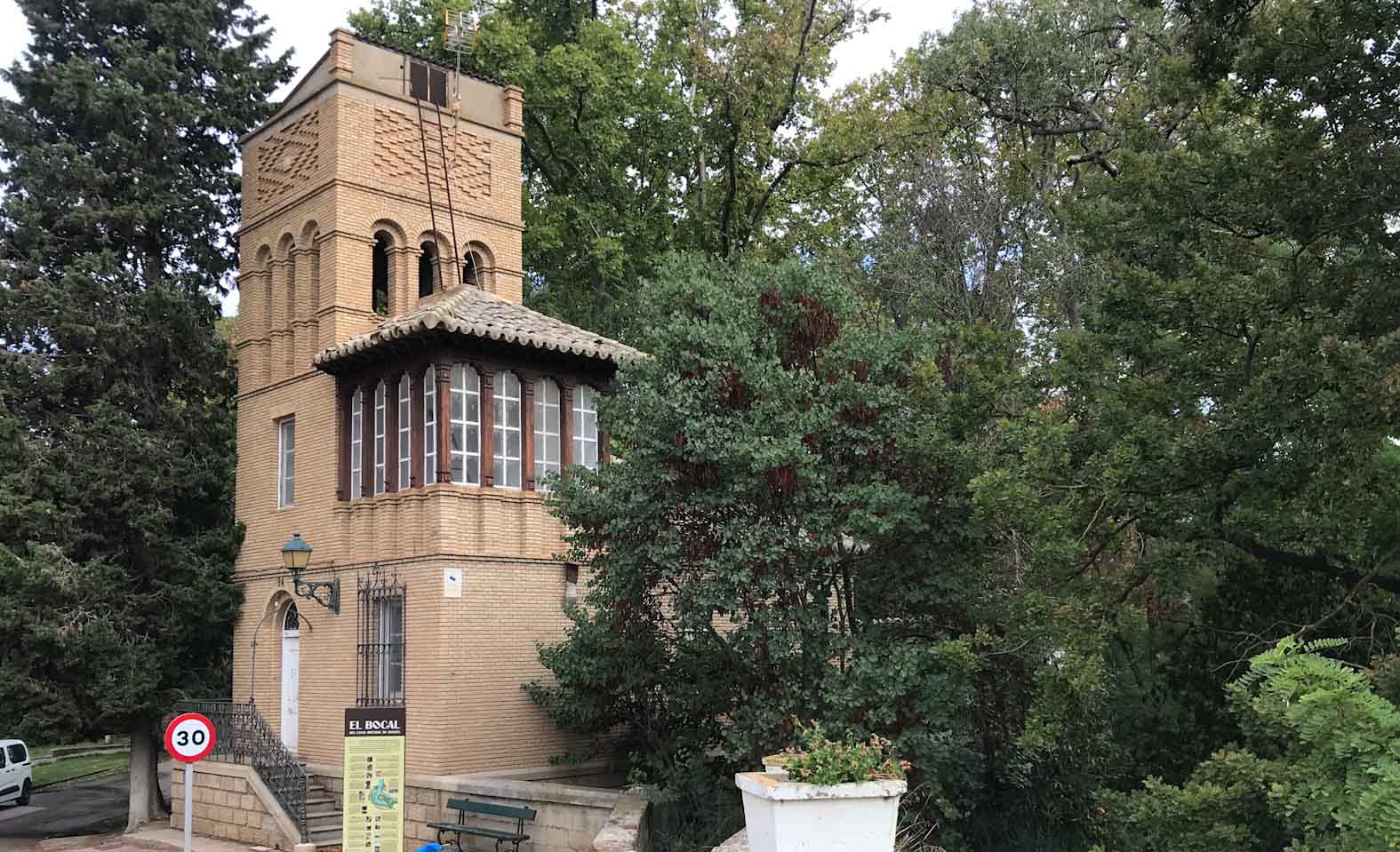 El nostre recorregut comença al Bocal (Fontellas), on neix. Les instal·lacions només es poden visitar els caps de setmana, és dijous i hi anem a veure què veiem. Passem pel petit pont de Formigales i arribem a la reixa… oberta. Hi entrem i mentre llegim un rètol explicatiu, surt un cotxe de dins i se’n va; quan ens girem, veiem que han tancat la reixa. Oh, però… si som dins, aprofitem! Estem davant la Torre del jardiner, un home que, vistos els jardins, devia tenir molta feina. Al davant estan rehabilitant un edifici a tocar del canal. Passegem sota uns arbres frondosos cap endins (hi ha un roure monumental), veiem l’església de S. Carles Borromeo, de línies clàssiques a la façana però amb un àbsis neomudèjar afegit el s. XIX, la primera presa… A l’hora de sortir, els paletes ens obren la reixa i ja està.