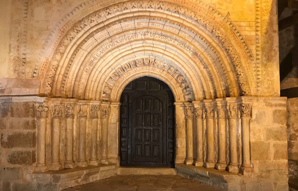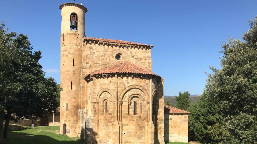 Després baixem, creuem la carretera i anem per l’altra banda fins a la Colegiata de San Martin de Elines. Just al baixar del cotxe una dona ens diu que no veu la bicicleta que deixa la noia que l’obre. “Potser avui fa festa perquè celebren la patrona de Polientes…” Doncs sí. Es l’única colegiata de Cantàbria que conserva pintura romànica original del s. XII. El campanar rodó adossat, de 24 metres, tenia funcions defensives.