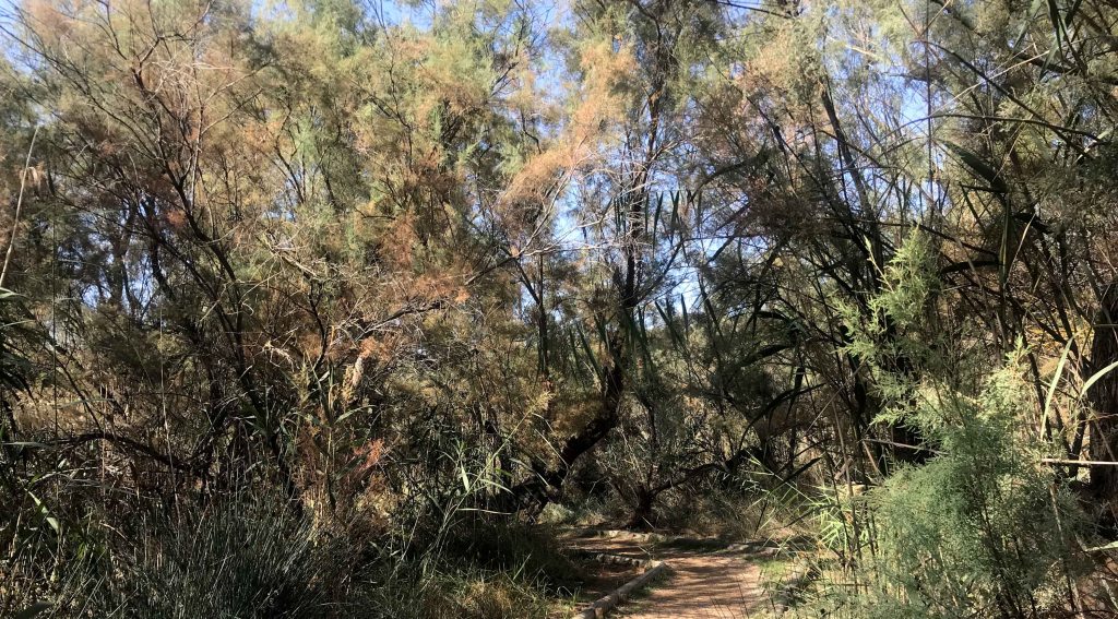Anem fins a la Presa de Riba-roja on ens creuem amb un cotxe anglès, el primer d’una sèrie de vehicles britànics que circulen per aquestes terres. El camí voreja el riu fins arribar a Flix, per l’Espai Natural Protegit de la Ribera de l’Ebre a Flix, que comprèn la Reserva natural de Sebes i el Meandre de Flix. Intentem fer un tram des del pantà en cotxe però el GR es va fent difícil i desistim. Hi anem des de Flix. El Mas del Director, que és el centre d’informació només obre als matins, però podem anar per la passera del canyissar fins a l’observatori d’aus on veiem un cabusset i després caminem pel sender fins al següent observatori, envoltades de tamarius; el conjunt s’anomena tamarigar. L’any 1975 es va localitzar un petit insecte heteròpter que s’alimenta de les fulles dels tamarius i que no ha estat trobat en cap altre lloc del món. En aquesta reserva hi ha dos tipus de tamarius i també joncs, corretjola, regalèssia i enfiladissa. Aprofitant un d’aquests elements, fan una cervesa artesana anomenada Lutra, que s’elabora amb aromes de menta i regalèssia. Anem més endavant pel GR on hi ha, en diferents espais: cavalls de la Camarga, nius i cria de cigonyes i un sender cap a un poblat iber, però no ens veiem amb cor de pujar per la calor.