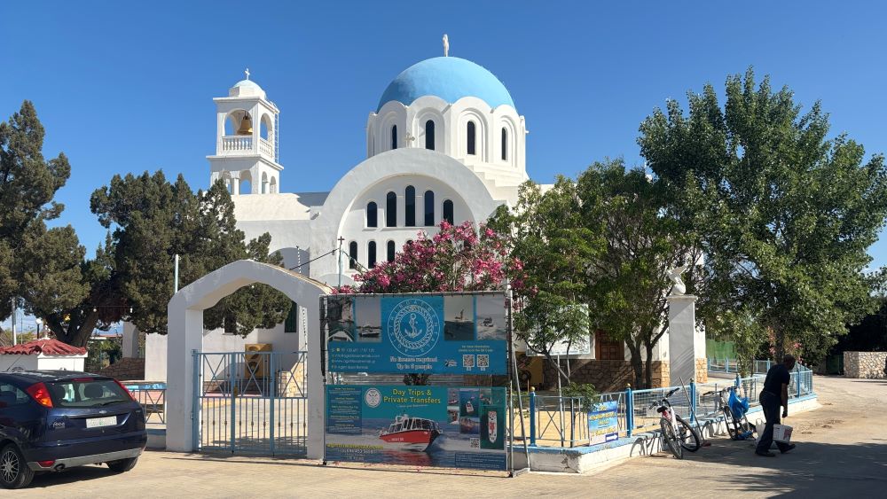 A l’illa només hi ha busos a l’estiu. Les distàncies no són excessives, vistes les dimensions, però no tot és pla. Hi ha única carretera que va d’Skala, el port on vam atracar, passa per Megaloxóri, on estem, i continua cap a la desviació a la cala de Dragonera; després s’endinsa per anar a un nucli de població al sud-est, Limenaria i una platja propera, Mariza. D’aquí torna a anar a l’oest per la costa, fins al llac i illeta d’Aponissos. Hi ha força gent que fa els senders caminant, o amb bicicleta però hem vist molts ciclistes bufant i arrossegant la bici. La majoria dels cotxes que hi ha són de gent de la pròpia illa. S’hi crien cavalls i a Aponissos hi ha un centre d’equitació.