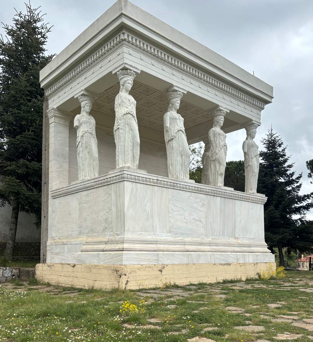 En el retorn a Atenes passem per Karuai o Kariés d’on deriva el nom de “cariàtides”. Molta gent hi va a veure la rèplica de les Cariàtides de l’Acròpolis. Els escultors grecs van donar el nom de Cariàtides a les figures de dones dansaires que feien servir de columnes. Vitruvi explica que el poble de Kàries es va revoltar a favor dels perses després de la Batalla de les Termòpiles i els aliats grecs van atacar la ciutat i la van destruir, prenent captives les dones i fent-ne representacions a les construccions en lloc de columnes, però hi ha fonts que ho neguen. L’Associació del poble va fer una rèplica en un punt alt del poble. No són les reals, però tot neix aquí. I n’estan orgullosos, gairebé tant com dels plataners monumentals que hi ha a l’entrada.