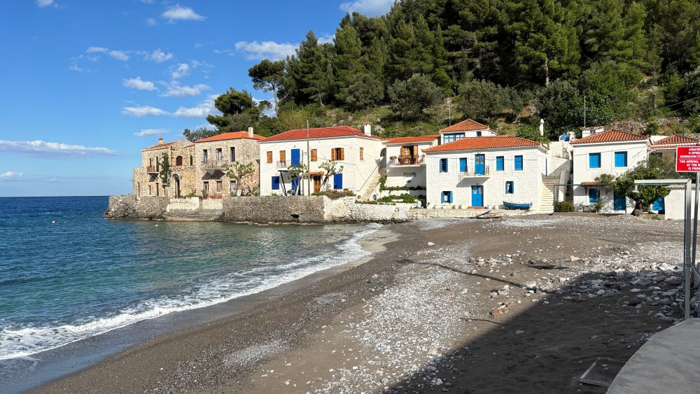 Kiparissi (45 km de revolts, 1h), en un racó, connectat per primera vegada a tot el Peloponès als any 70. Hi ha coves i penya-segats molt buscats pels escaladors i hi viuen uns 400 habitants. En el programa Afers exteriors de Mikimoto fa anys, van parlar d’aquest lloc, i ens el vam apuntar. Hem trigat, però ara arribem a Kyfanta Hotel i ens rep l’Ester. Tenim un estudi molt maco. Passejada al capvespre: veiem cases potents amb tarongers i llimoners amb fruits pel terra. Moltes són d’americans que viuen fora. L’endemà caminem fins a la platja d’Agia Kiriakí i el petit port d’Agios Nikolaos. El dia de Sant Jordi anem a l’ermita de S. Jordi (és un altre Jordi) per un camí de ronda, voltades de plantes i herbes.