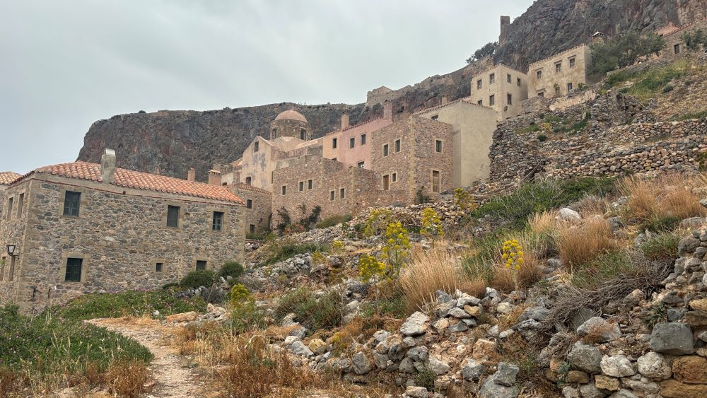 Un dia visitem Monemvassia. Fundada a partir del s VI aC, amb els bizantins és el centre econòmic del Peloponès. Poc després de l’entrada hi ha la casa del poeta Iannis Ritsos. Un munt de turistes omple el carreró principal. A banda i banda, cafeteries, galeries d’art, capelles… algun petit hotel. Arribem al punt final tocant a la muralla. L’església d’Agia Sofia domina la part superior amb vistes a les muntanyes de Lacònia. Més avall, en una esplanada, destaca la blanca capella de la Verge de Xrisafitissa. L’Ester ens explica després que Sitges està agermanada amb Monemvassia perquè tenen el mateix tipus de raïm, la malvasia.