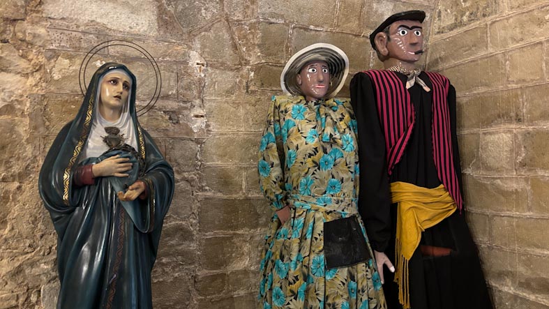 D’aquí vam anar a Forès. EL nucli antic s’alça dalt d’un turó, a 866 m. Des del gran mirador, les vistes són impressionants: Montserrat i el Montseny, la serra de Brufaganya, el Montclar, el puig de Formigosa, Montagut, el Cogulló, la serra de Miramar… les muntanyes de Prades. A l’església de Sant Miquel, d’origen romànic, destaca la Porta de les Dones. Per entrar a l’interior cal dipositar un euro en una caixeta i s’obre la porta. Presideix l’altar principal una còpia de la imatge gòtica de la Mare de Déu de la Salut (l’original és al Museu Diocesà de Tarragona), del 1324, del pintor montblanquí Francesc de Penedès. Ens ha fet gràcia veure-hi els gegants del poble, al costat d’una gran imatge d’una mare de déu… i un xic més enllà, el Sant Crist. Una combinació curiosa.
