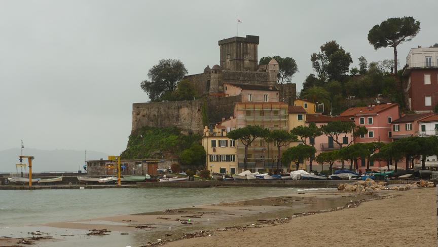 Vernazza és on ens allotgem durant tota l’estada; davant tenim el torrent Vernazzola, cobert, però quan pot, remuga i surt de mare. Baixant cap a mar, a banda i banda, carrerons i escales (“arpaie”), botigues de records, bars, restaurants, productes típics… i molta gent. De seguida som a baix: un petit port tancat, una petita platja i barques a terra, tapades. El poble va jugar un paper important a l’Edat Mitjana (es nota per les logies, cases-torres i pòrtics). Restes d’un castell dels poderosos Doria, una església tocant a mar, amb murs ferms per aguantar la mar i els pirates. Un forat en un roca per on passes entre aigües i arribes a l’altra banda: una platja plena de visitants que trepitgen les pedres, recullen bastons nets i pelats que la tempesta hi ha deixat i fan fotos amb mòbils, tauletes i màquines de retratar. Pujant amunt, cap al nord, un mirador, el cementiri, un edifici municipal i una església amb un campanar que vèiem des de lluny.Vistes superbes del port i les façanes de colors. A dalt, el santuari de N. Sra. Reggio.